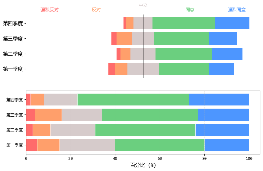 # 模拟数据:4个季度,5个满意度维度(强烈反对、反对、中立、同意、坚决同意)