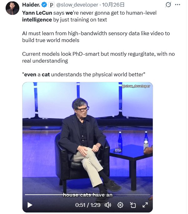 在他看来,LLM甚至连家猫的智能都无法比拟。