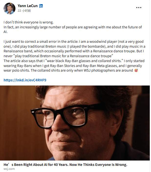 “我认为并不是所有人都错了。事实上,越来越多的人开始认同我对人工智能未来的看法。”