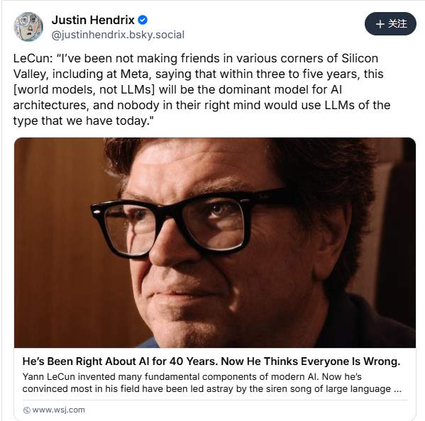 在上个月麻省理工学院的一次研讨会上,这位65岁的科学家更是放出“狠话”:“我一直在硅谷……包括在Meta内部,树敌不少。因为我曾说,在三到五年内,世界模型将成为AI架构的主导模型,任何神志清醒的人都不会使用我们今天拥有的这类LLM。”