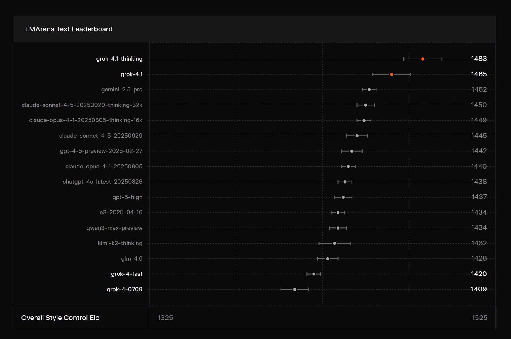 LMArena是一个开源工具,用户可以通过并排、盲测的方式,比较不同大语言模型的表现。在这个竞争最激烈的“斗兽场”里,Grok 4.1取得了惊人的成绩: