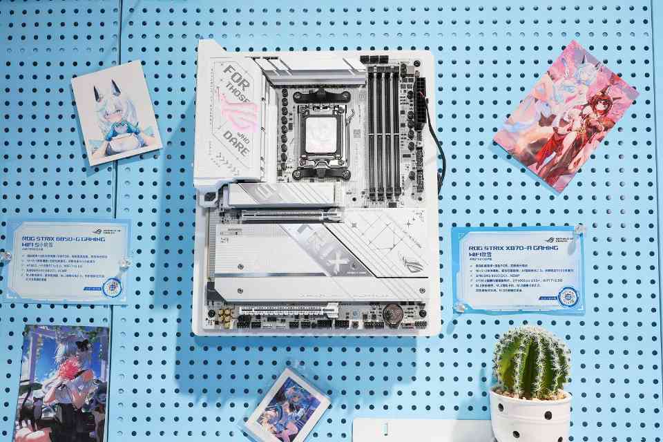 另外ROG玩+乐园还有备受广大二次元玩家喜爱的天选区,这里的天选全家桶主机同样引人注目,位于其中的华硕B860天选主板身披超大面积月光银散热装甲,搭配魔幻青专属配色和钻切工艺的TX LOGO,颜战双修,是打造浅色主题小主机的又一绝佳选择。板载3个M.2接口,其中1个还支持PCIe 5.0。预装一体化I/O挡板,拥有丰富的USB接口,包含USB 20Gbps Type-C接口,前置USB Type-C接口等,疾速互联,秀出高能。此区域还单独展示了天选家族的B860天选、B650E天选主板,带给二次元游戏玩家更多、更好的选择。